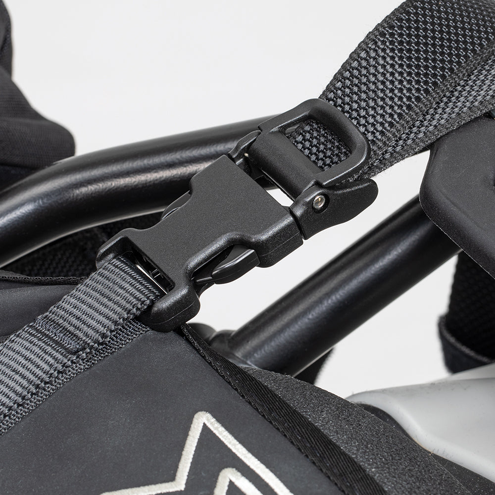 New X STRAPS provide extra pack stability and improved pack clearance from the exhaust silencer.